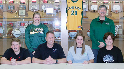 Pictured at the signing front row (l-r): Evan, her brother; Larry, Ashtyn and Susan Lagemann. Second row: Mindy Eckert, assistant coach at John Wood Community College and Norman Rodriguez, head coach at John Wood Community College.