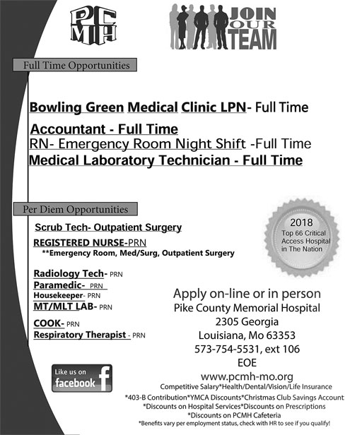 HOME HEALTH & HOSPICE SOCIAL WORKER The Pike County Health Department is seeking a Home Health & Hospice Social Worker. Graduation with a bachelor’s degree in Social Work or Master of Social Work degree from an institution accredited by the Council on Social Work Education is required and 1 year of social work experience in a health care setting, preferably home care. This will be a part time 24 hour/week position. Please submit resume to Pike County Health Department, C/O Human Resources, 1 Healthcare Place, Bowling Green, MO 63334. EOE