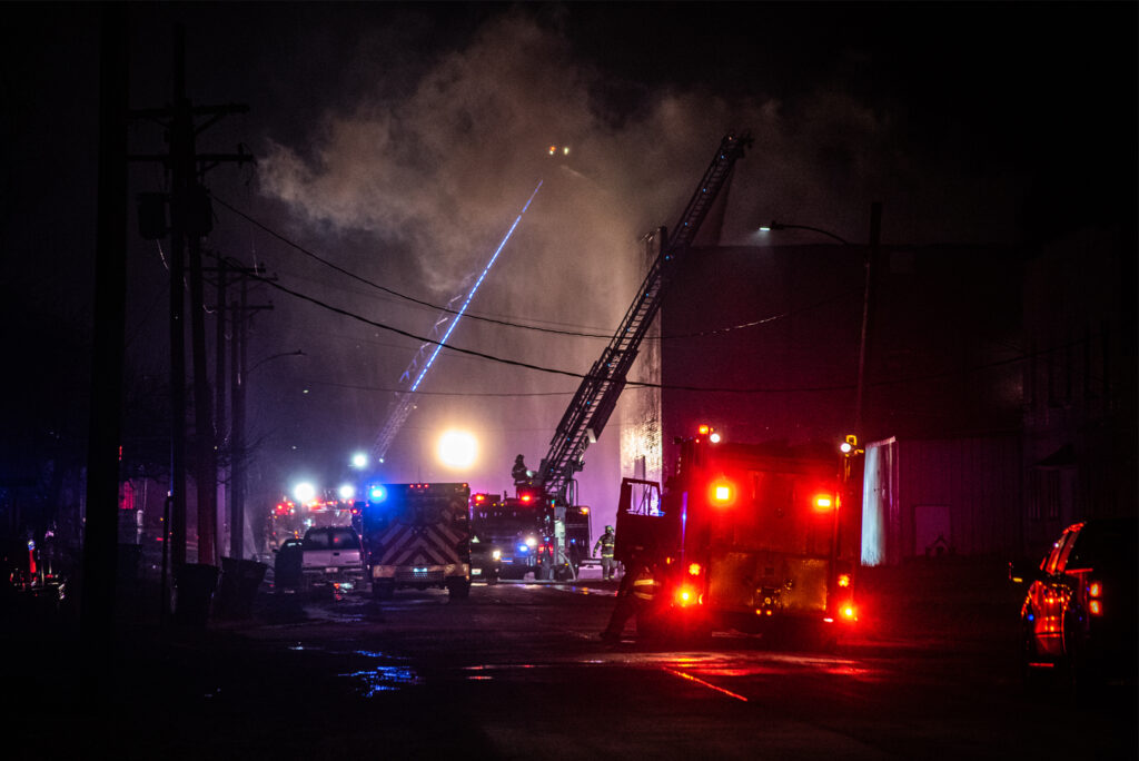 “On arrival, fire crews saw smoke coming from all four corners of the building, out from along the roofline, and through several cracks noted on the upper exterior walls,” he stated. “Crews started suppressions efforts on the north side of the structure in attempts to control the fire.”